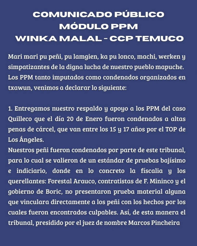 1. Entregamos nuestro respaldo y apoyo a los PPM del caso Quilleco que el día 20 de Enero fueron condenados a altas penas de cárcel, que van entre los 15 y 17 años por el TOP de Los Ángeles.