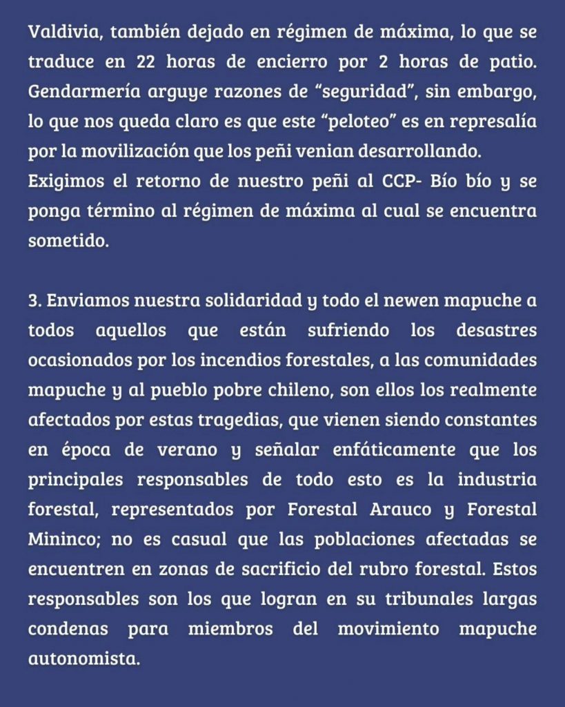 3. Enviamos nuestra solidaridad y todo el newen mapuche a todos aquellos que están sufriendo los desastres ocasionados por los incendios forestales, a las comunidades mapuche y al pueblo pobre chileno, son ellos los realmente afectados por estas tragedias, que vienen siendo constantes en época de verano y señalar enfáticamente que los principales responsables de todo esto es la industria forestal, representados por Forestal Arauco y Forestal Mininco; no es casual que las poblaciones afectadas se encuentren en zonas de sacrificio del rubro forestal. Estos responsables son los que logran en su tribunales largas condenas para miembros del movimiento mapuche autonomista.