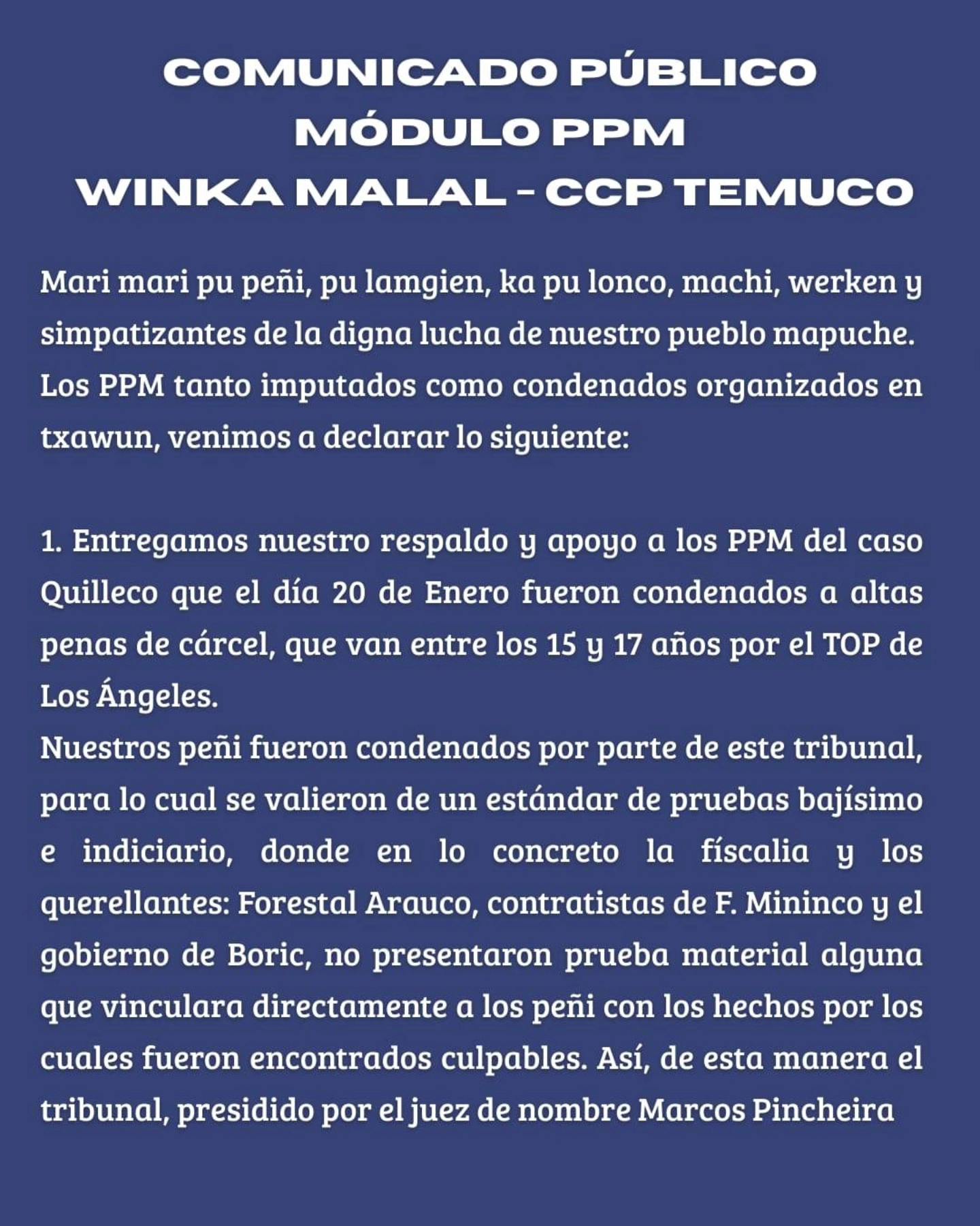 1. Entregamos nuestro respaldo y apoyo a los PPM del caso Quilleco que el día 20 de Enero fueron condenados a altas penas de cárcel, que van entre los 15 y 17 años por el TOP de Los Ángeles.