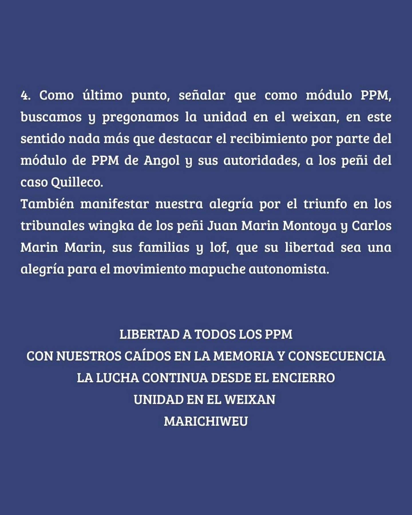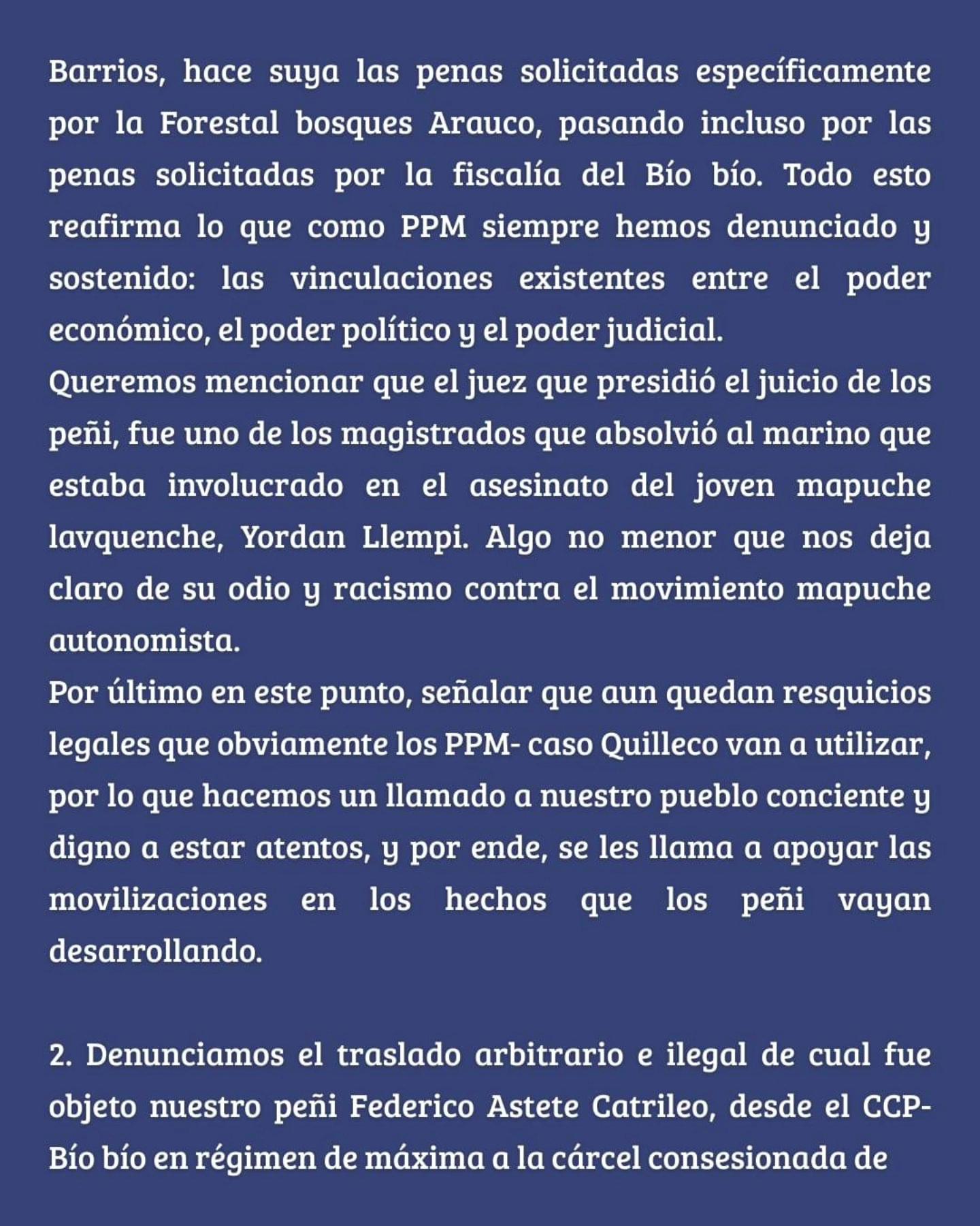 Por último en este punto, señalar que aún quedan resquicios legales que obviamente los PPM- caso Quilleco van a utilizar, por lo que hacemos un llamado a nuestro pueblo consciente y digno a estar atentos, y por ende, se les llama a apoyar las movilizaciones en los hechos que los peñi vayan desarrollando.