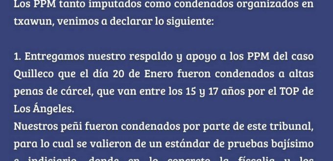 CompartirFacebookTwitterWhatsappPrintEmail27 de enero de 2026 | Comunicado Mari mari pu peñi, pu lamgien, ka pu lonco, machi, werken y simpatizantes de la digna lucha de nuestro pueblo mapuche.Los PPM tanto imputados como condenados organizados en txawun, venimos a declarar lo siguiente: 1. Entregamos nuestro respaldo y apoyo a los PPM del caso Quilleco que el … Sigue leyendo Comunicado público módulo PPM Winka Malal- CCP Temuco