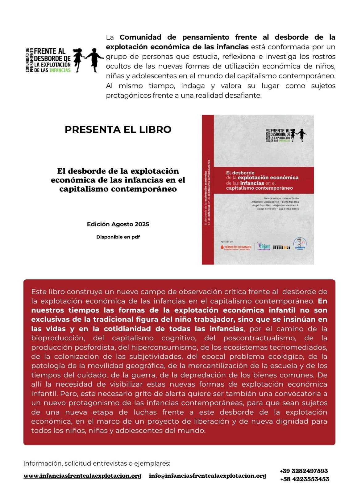 Les presentamos este importante libro, resultado de años de trabajo de un colectivo de investigadoras e investigadores de diferentes lugares del mundo, militantes sociales con un largo recorrido en el acompañamiento a infancias y adolescencias organizadas, que conforman la “Comunidad de Pensamiento frente al Desborde de la Explotación de las Infancias”. Comunidad que comparte el interés de develar las nuevas formas de explotación hacia las infancias bajo la lógica del capitalismo contemporáneo. El libro a su vez reivindica el rol protagónico de niñas, niños y adolescentes, concibiéndolos como sujetos políticos para la construcción de nuevas lógicas de carácter liberador.